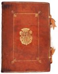 Enc. en tafilete, con hierros y superlibris dorados en ambos planos y cintas de raso, cortes dorados y cincelados, alguna restauración en puntas y cabeceras del lomo, bien realizadas.