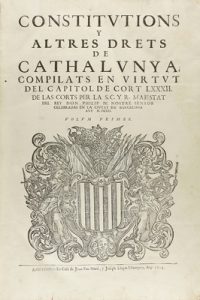 1704. LIBRO : (DERECHO CATALÁN). CONSTITUTIONS Y ALTRES DRETS DE CATHALUNYA COMPILATS EN VIRTUT DEL CAPITOL DE CORT LXXXII DE LAS CORTS PER LA S. C. Y R. MAJESTAT DEL REY DON PHILIP IV NOSTRE SENYOR CELEBRADAS EN LA CIUDAD DE BARCELONA ANY...