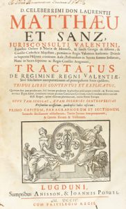 1704. LIBRO : (DERECHO). MATTHAEU ET SANZ, LAURENTII: TRACTATUS DE REGIMINE REGNI VALENTIAE sive selectarum interpretationum ad principaliores foros ejusdem. Lugduni (Lyon) : Anisson, & Joannis Posuel, 1704. Folio. 16 h., incluyendo la...