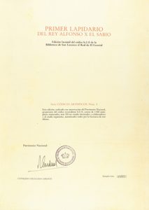 Facsímil del manuscrito esculiarense h.I.15 comprende actualmente 118 folios (más una hoja en blanco, sin numerar), de los que se han reproducido fielmente los 93 primeros, que contienen el Primer Lapidario, el más amplio y mejor ilustrado de los 4 recogidos en el códice.