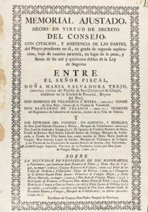 1772. LIBRO : (NOBLEZA). ESCOLANO, PEDRO PASQUAL DE: MEMORIAL AJUSTADO... ENTRE EL SEÑOR FISCAL, DOÑA MARIA SALVADORA TREJO... Y LOS ESTRADOS DEL CONSEJO... SOBRE LA SUCESION EN PROPIEDAD DE LOS MAYORAZGOS Y PATRONATOS. Madrid : S. imp.,...