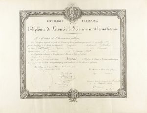 1882 y 1887. MANUSCRITO : (MASONERÍA). DOS DIPLOMAS EXPEDIDOS SOBRE PERGAMINO VITELA. Pergamino de 35 x 45 cm con orla y texto francés impreso, se trata de un diploma de licenciado en ciencias matemáticas expedido a nombre de Bonnal Antoine...