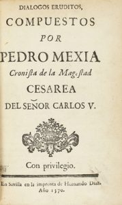 1570 [1765 ca.]. LIBRO : (HISTORIA ESPAÑA). MEXIA, PEDRO: DIALOGOS ERUDITOS COMPUESTOS POR... cronista de la Magestad Cesarea del señor Carlos V. Savilla (sic.) : Imp. Hernando Diaz, 1570. 8º menor. 8 h. + 269 p.