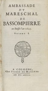 1668. LIBRO : (HISTORIA). AMBASSDE DU MARESCHAL BASSOMPIERRE EN SUISSE L´AN 1625. Cologne : Chez Pierre du Marteau, 1668. 2 vol. en 8º menor.