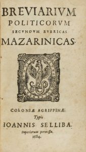 1684. LIBRO : (POLÍTICA). [MAZARIN, JULES]: BREVIARIUM POLITICORUM SECUNDUM RUBRICAS MAZARINICAS. Coloniae Agrippinae : Typ. Ioannis Selliba, 1684. 8º menor. 4 h. + 139 p. + 1 h.