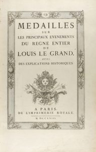 1723. LIBRO : (NUMISMÁTICA-HISTORIA). [GROS DE BOZE, CHARLES: ]. MEDAILLES SUR LES PRINCIPAUX EVENEMENTS DU REGNE ETIER DE LOUIS LE GRAND, AVEC DES EXPLICATIONS HISTORIQUES. Paris : Imp. Royale, [Par les soins de Rigaud, Directeur de...