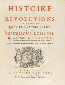 1734. LIBRO : (HISTORIA). VERTOT: HISTOIRE DES RÉVOLUTIONS ARRIVÉES DANS LE GOUVERNEMENT DE LA RÉPUBLIQUE ROMAINE. La Haye : Chez Antoine van Dole, 1734. 4º menor. 3 h. + VIII + 1 h. + 422 p. + 9 h.
