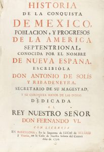 1756. LIBRO : (HISTORIA). SOLIS DE RIBADENEYRA, ANTONIO DE: HISTORIA DE LA CONQUISTA DE MEXICO, POBLACION, Y PROGRESOS DE LA AMERICA SEPTENTRIONAL... Barcelona : Imp. Lucas de Bezares y Urria, 1756. Folio menor. 14 h. + 548 p. + 7 h.