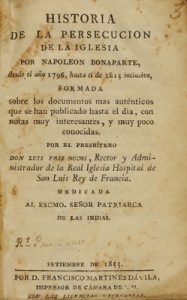 1815. LIBRO : (HISTORIA). FRIS DUCOS, LUIS: HISTORIA DE LA PERSECUCION DE LA IGLESIA. [Madrid] : Imp. de Cámara de S. M. D. Francisco Martinez Dávila, 1815. 8º menor. 223 p. + 1 h.
