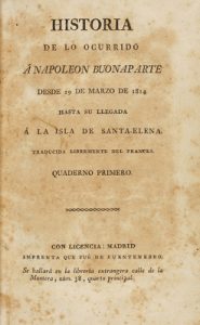 1817. LIBRO : (HISTORIA). HISTORIA DE LO OCURRIDO Á NAPOLEON BUONAPARTE. Desde 29 de marzo de 1814 hasta su llegada á la isla de Sant-Elena. (Tres quadernos). Traducida al castellano por Agustin Dené. Madrid : Imp. que fue de Fuentenebro, 1817.