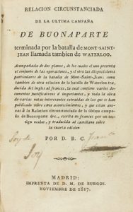 1817. LIBRO : (HISTORIA). RELACIÓN CIRCUNSTANCIADA DE LA ULTIMA CAMPAÑA DE BUONAPARTE. TERMINADA POR LA BATALLA DE MONT-SAINT-JEAN LLAMADA TAMBIÉN DE WATERLOO. Madrid, Imp. de M. Burgos, 1817. 8º menor. XXIV p. + 358 p. + 82 p. + 2 mapas...
