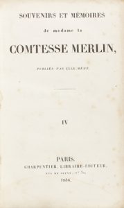 1836. LIBRO : (HISTORIA). MERLIN: SOUVENIRS ET MÉMOIRES DE MADAME LA COMTESSE MERLIN. Paris : Lib. Charpentier, 1836. 4 vol. en 8º.
