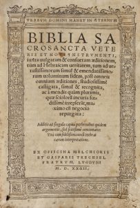 1532. LIBRO : (HUMANIDADES). BIBLIA SACROSANCTA VETERIS ET NOVI INSTRUMENTI... Lugduni : Ex Officina Melchioris et Gasparis Trechsel fratrum, 1532. 8º. 8 h. + 506 fol. + 6 h.