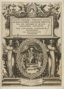 1584. LIBRO : (VIRGEN MARIA). STEPHANUM VALENTINUM, IOSEPHUM: SACRI ROSARII VIRGINIS MARIAE AB HAERETICORUM CALUMNIIS DEFENSIO UNA CUM MYSTERIIS ET BULLIS ROMANORUM PONTIFICUM. Romae : Typ. Dominici Basae, 1584. 8º mayor. 6 h. + 209 p.