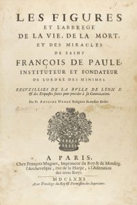 1671. LIBRO : (RELIGIÓN-ÓRDENES RELIGIOSAS). DONDE, ANTOINE: LES FIGURES ET L´ABBREGÉ DE LA VIE, DELA MORT, ET DES MIRACLES DE SAINT FRANÇOIS DE PAULE, INSTITUTEUR ET FONDATEUR DE L´ORDRE DES MINIMES. Paris : Chez François Muguet,...