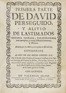 1698. LIBRO : (HUMANIDADES). LOZANO, CHRISTOVAL: PRIMERA PARTE DE DAVID PERSEGUIDO, Y ALIVIO DE LASTIMADO, HISTORIA SAGRADA, PARAPHRASEADA CON EXEMPLOS... Valencia : s.imp., 1698. 8º mayor. 4 h.+ 400 p.
