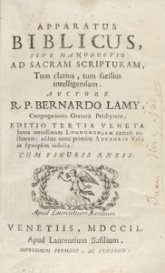 1749. LIBRO : (HUMANIDADES). LAMY, BERNARDO: APPARATUS BIBLICUS, SIVE MANUDUCTIO AD SACRAM SCRIPTURAM, TUM CLARIUS, TUM FACILIUS INTELLIGENDAM. Venetiis : Apud Laurentium Basilium, 1749. 8º. 16 h. + 747 p. y 12 lám. plegadas. fuera del texto.