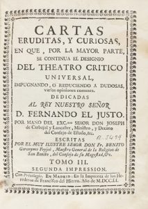 1751. LIBRO : (HUMANIDADES). FEYJOO, BENITO GERONYMO: CARTAS ERUDITAS, Y CURIOSAS, EN QUE, POR LA MAYOR PARTE, SE CONTINUA EL DESIGNIO DEL THEATRO CRITICO UNIVERSAL... TOMO III. Madrid : Imp. Herederos de Francisco del Hierro, 1751. 8º. 29 h....