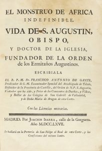 1767. LIBRO : (HAGIOGRAFÍA). GANTE, AMTONIO DE: EL MONSTRUO DE AFRICA INDEFINIBLE. VIDA DE S. AUGUSTIN, OBISPO Y DOCTOR DE LA IGLESIA, FUNDADOR DE LA ORDEN DE LOS ERMITAÑOS AUGUSTINOS. Madrid : Joachin Ibarra, 1767. 8º mayor. 8 h. + 496 p.