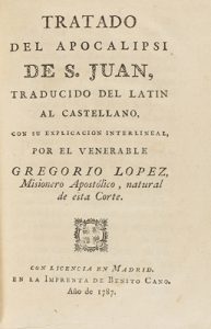 1787. LIBRO : (RELIGIÓN-ESCATOLOGÍA). LOPEZ, GREGORIO: TRATADO DEL APOCALIPSI DE S. JUAN, TRADUCIDO DEL LATIN AL CASTELLANO, CON SU EXPLICACION INTERLINEAL. Madrid : Imp. Benito Cano, 1787. 8º menor. 2 h. + XXXII + 298 p.