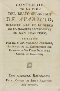 1792. LIBRO : (RELIGIÓN). CORRIOLS, EUDALDO: DE LA VIDA DEL BEATO SEBASTIAN DE APARICIO, RELIGIOSO LEGO de la orden de P.P menores observantes de San Francisco. Barcelona : Oficina de Isidro Aguasvivas, 1792. 8º. 3 h. + 170 p.