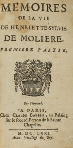 1671-1672. LIBRO : (LITERATURA FRANCESA). VILLEDIEU, MARIE-CATHERINE-HORTENSE DE: MEMOIRES DE LA VIE DE HENRIETTE-SYLVIE DE MOLIERE. 4 partes (de 6). Paris : Chez C. Barbin, 1671-1672. 8º menor. 3 h. + 64 p. + 1 h. + 84 p. + 148 p.