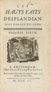 1751. LIBRO : (LITERATURA). LES HAUTS FAITS D´ESPLANDIAN. SUITE D´AMADIS DES GAULES. Amsterdam : Chez Jean-François Jolly, 1751. 8º. 2 h. + 216 p. + 208 p.