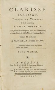 1785-1786. LIBRO : (LITERATURA). RICHARDSON, SAMUEL: CLARISSE HARLOWE. Genève et Paris : Imp.-Libr. Paul Barde et Moutard et Merigot, 1785-1786. 10 vol. 3 en 8º mayor. 450-500 p. c/u. aprox.