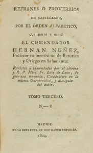 1804-1806. LIBRO : (PAREMIOLOGÍA). NUÑEZ [DE TOLEDO], HERNAN [GERMAN]: REFRANES O PROVERBIOS EN CASTELLANO, POR EL ÓRDEN ALFABÉTICO. Madrid : Imp. de Don Mateo Repullés, 1804. 2 vol. en 8º menor.