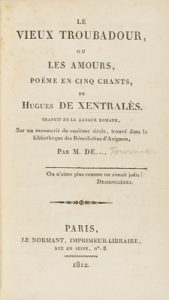 1812. LIBRO : (LITERATURA). FOURNIER, M. DE: LE VIEUX TROBADOUR, OU LES AMOURS, POËME EN CINQ CHANTSS, DE HUGUES DE XENTRALÈS, TRADUIT DE LA LANGUE ROMANE... PAR. Paris : Imp. Le Normant, 1812. 8º menor. 138 p. + 1 h.