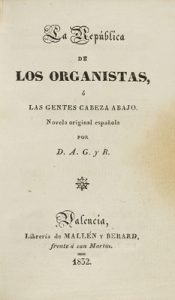 1832. LIBRO : (SATÍRICA). D. A. G. y R. [GUIJARRO Y RIPOLL, ANTONIO]: LA REPÚBLICA DE LOS ORGANISTAS Ó LAS GENTES CABEZA ABAJO. Valencia : Imp. J. Ferrer de Orga,1832. 12º menor. 4 h. + 223 p.
