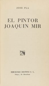 1944. LIBRO : (LITERATURA-DEDICATORIA). PLA, JOSEP: EL PINTOR JOAQUIN MIR. Barcelona : Ediciones Destino, 1944. 8º. 206 p.+ 8 h. Ilustr. con láminas fotográficas del artista, reproducciones de sus cuadros y dibujos, etc., fuera de texto.