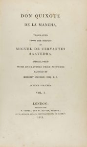 1818. LIBRO : (CERVANTINA). CERVANTES SAAVEDRA, MIGUEL DE: DON QUIXOTE DE LA MANCHA. Translated from the spanish of ... Embellished with engravings from pictures painted by Robert Smirke, esq. R. A. In four volumes. London : T. Cadell and W....