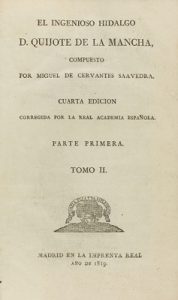 1819. LIBRO : (CERVANTINA). CERVANTES SAAVEDRA, MIGUEL DE: EL INGENIOSO HIDALGO D. QUIJOTE DE LA MANCHA. Madrid : Imp. Real, 1819. 4 vols. en 8º.