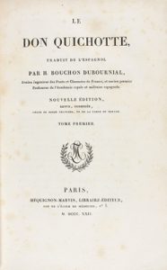 1822. LIBRO : (CERVANTINA). CERVANTES SAAVEDRA, MIGUEL DE: LE DON QUICHOTTE. Trad. Bouchon Dubournial. París : Méquignon-Marvis Libr. Edit., 1822. 4 vols. en 4º menor.
