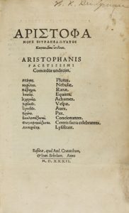 Primera edición realizada por Grynaeus (1493-1541), y es la primera vez que se reunen todas las comedias del autor griego. Brunet I, 452.