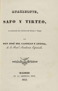 1832. LIBRO : (LITERATURA). ANACREONTE, SAFO Y TIRTEO, TRADUCIDOS DEL GRIEGO EN PROSA Y VERSO POR DON JOSÉ DEL CASTILLO Y AYENSA... Madrid : Imp. Real, 1832. 8º. 3 h. + XXXVIII + 1 h. + 264 p. + 1 h. + 4 partituras plegadas.