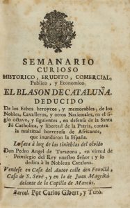 1780 ca. LIBRO : (CATALUNYA). TARAZONA, PEDRO ANGEL DE: TARAZONA, PEDRO ANGEL DE: . SEMANARIO CURIOSO, HISTORICO, ERUDITO, COMERCIAL, PUBLICO Y ECONOMICO. EL BLASON DE CATALUÑA. TOMO 1. Barcelona : Carlos Gibert y Tuto, s.a. 8º menor.