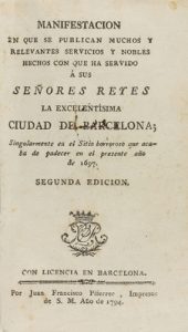 1794. LIBRO : (LOCAL-BARCELONA). MANIFESTACION EN QUE SE PUBLICAN MUCHOS Y RELEVANTES SERVICIOS Y NOBLES HECHOS CON QUE HA SERVIDO A SUS SEÑORES REYES LA EXCELENTISIMA CIUDAD DE BARCELONA ; SINGULARMENTE EN EL SITIO HORROROSO QUE ACABA DE...