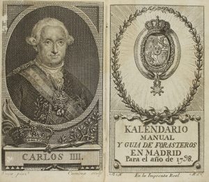 Retrato de Carlos IV por Goya, grabado por Carmona, portada dibujada por Mengs y grabada por Carmona.