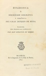 1807. LIBRO : (RUSIA). [LUQUE, EUGENIO DE]: ESTADÍSTICA O DESCRIPCIÓN GEOGRÁFICA Y POLÍTICA DEL GRAN IMPERIO DE RUSIA. Traducida del francés al castellano por don Enrique de Luque. Madrid : en la Imp. de la Hija de Ibarra, 1807. 8º menor.