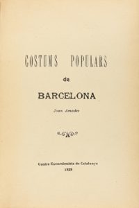 1929. LIBRO : (BARCELONA). AMADES, JOAN: COSTUMS POPULARS DE BARCELONA. Barcelona : Centre excursionista de Catalunya, 1929. 4º menor. 368 p. + 7 lám.