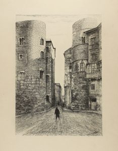 1944. LIBRO : (BARCELONA). GUTIERREZ MARIN, CARLOS: BARCELONA. EVOCACIONES DE LA CIUDAD ANTIGUA. Serie de 20 dibujos a pluma por... Texto explicativo por A. DURAN SANPERE. Barcelona : Imp. Altés, 1944. Gran folio. 2 hojas, 20 lám.
