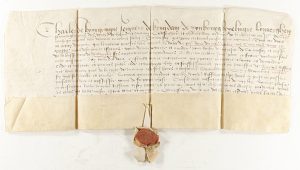 1525. MANUSCRITO : (PERGAMINO). CARTA DE CHARLES DE BORUGOGNE A FAVOR DE NICOLAS RIFFLARD. 19 X 37,5 cm. Manuscrito sobre pergamino donde se dan las cartas de crédito a Nicolas Rifflard por una casa situada en Villereche. Firmado el 20 de mayo...