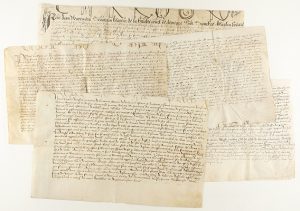 S. XVI. MANUSCRITO : (PERGAMINO). LOTE DE 7 MANUSCRITOS SOBRE PERGAMINO. El lote se compone de pergaminos de diferentes tamaños, comprendidos entre el 8º mayor y 4º mayor.