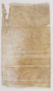 Donación de la dote de Caterina Gelis, hecha por su padre Aimeric Gelis y su hermano Miquel Gelis, así como la legítima correspondiente, con el consentimiento de Pere Moradell, futuro marido de Caterina. Rasgadura parcialmente cosida.