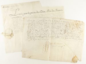 1660 Y 1690. MANUSCRITO : (PERGAMINO). DOS DOCUMENTOS SOBRE PERGAMINO DEL REY LUIS XIV DE FRANCIA. El de 1660 de 22 x 32 cm, presenta un corte limpio pero el texto está completo.
