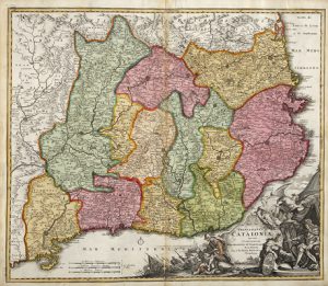 1735 ca. MAPA : (CATALUÑA). HOMANN, JUAN BAUTISTA: PRINCIPATUS CATALONIAE NEC NON COMITATUM RUSCINONENSIS ET CERRETANIA. Mapa grabado al cobre y coloreado de época de 49 x 57,5 cm.