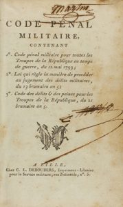 1º. Code pénal militaire pour toutes les Troupes de la République en temps de guerre, du 12 mai 1793 ;