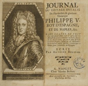1704. LIBRO : (VIAJES). BULIFON, ANTOINE: JOURNAL DU VOYAGE D´TALIE de l´invincible, & glorieux monarque Philippe V. Roy d´Espagne, et de Naples. Naples : Chez Nicolas Bulifon. 8º menor. Retrato + 10 h. + retrato + 436 p. + 1 plano plegado.